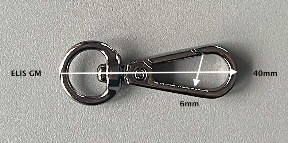 De clip is 4cm lang en heeft een doorgang van 6 mm. De ring is 1,5cm breed en 2mm dik; de haak is 3,5mm breed en 2mm dik.