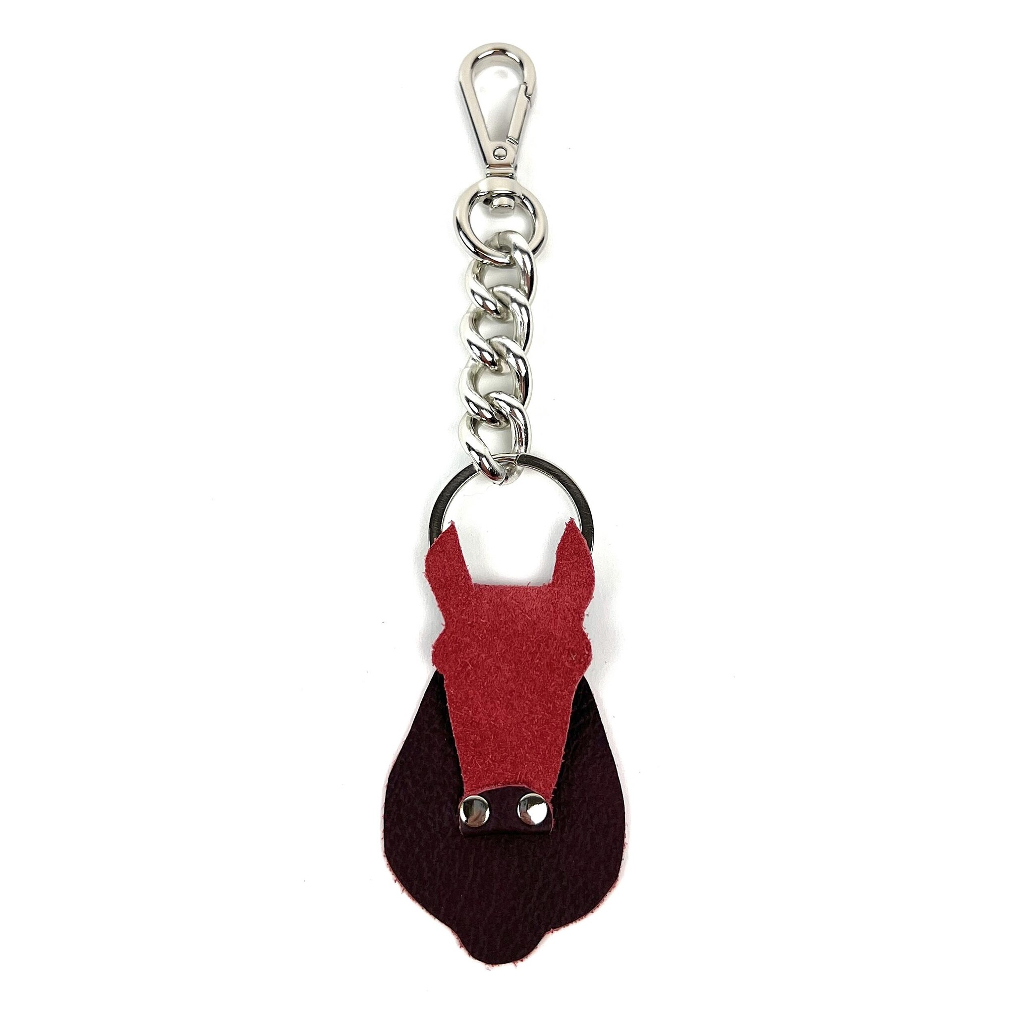 Sleutelhanger met leren paardenhoofd aan een zilverkleurige ronde ketting met clip. Lees meer