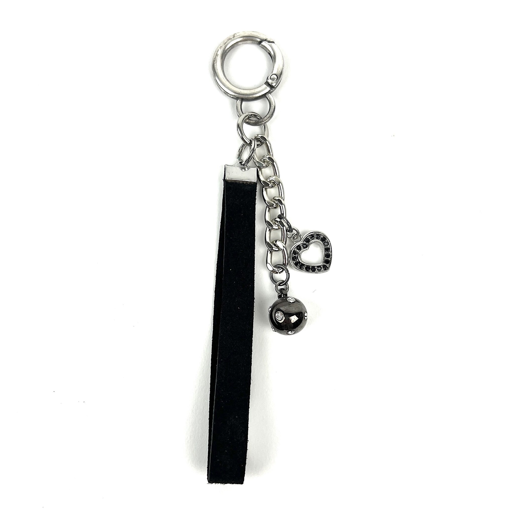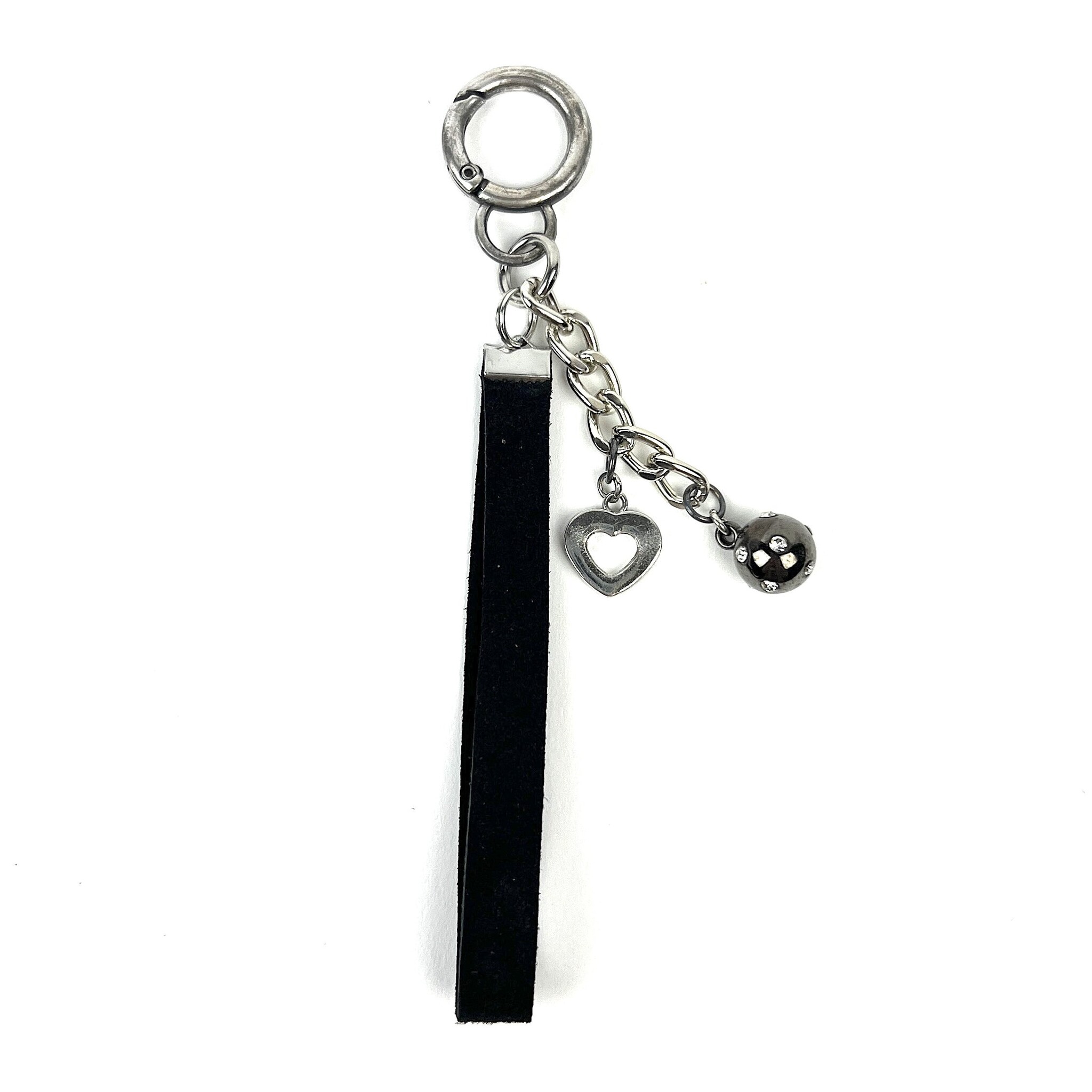 Veerring met aan het oog een zwart suède bandje van 1cm breed en 10cm lang en een kettinkje met hartje en glaskraal. De doorgang van de veerring is 7mm en de binnen diameter 16mm.