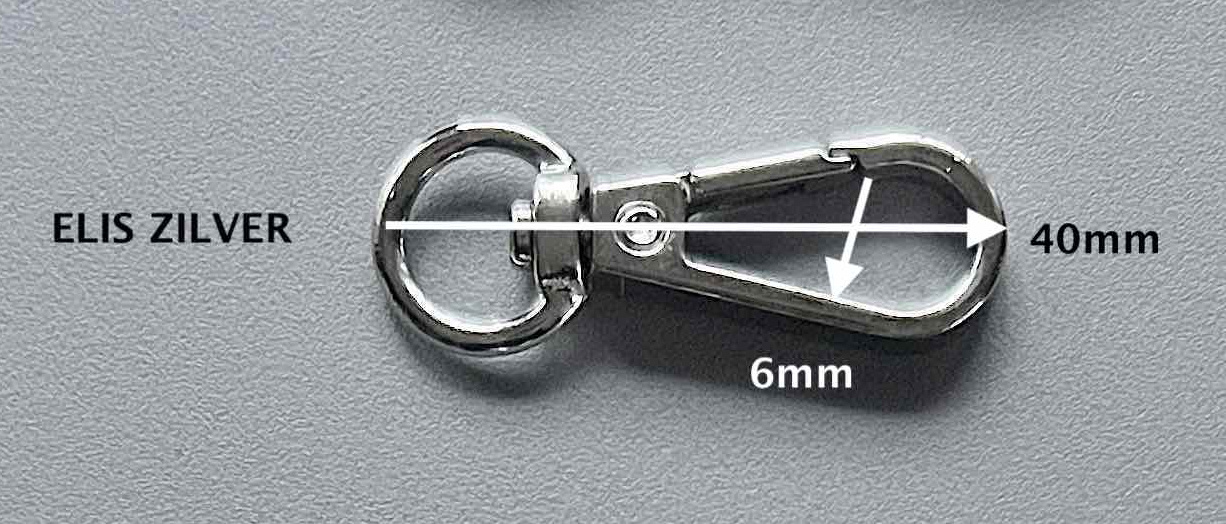De clip is 4cm lang en heeft een doorgang van 6 mm. De ring is 1,5cm breed en 2mm dik; de haak is 3,5mm breed en 2mm dik.